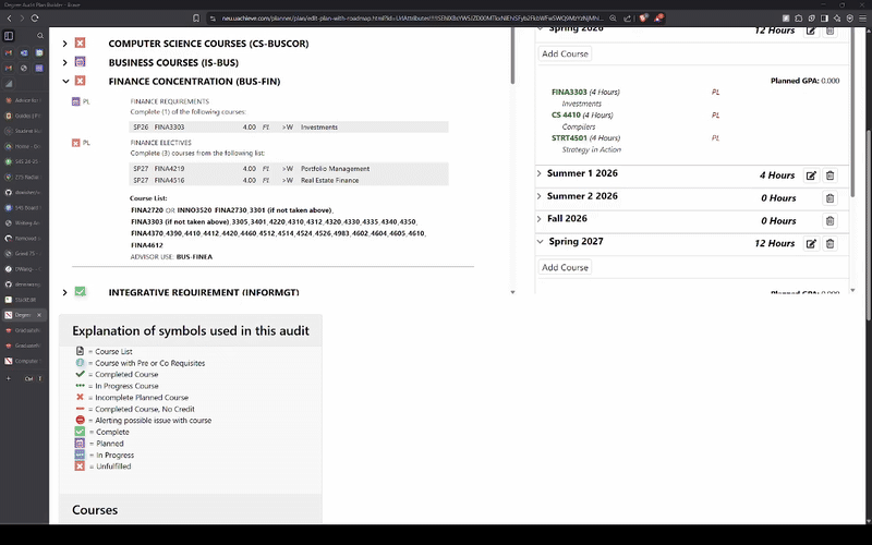 Our platform offers an immediately intuitive user interface that gives instant feedback. When you drag a course into a semester, you know immediately whether it counts toward your requirements. No waiting, no second-guessing, no confusion. We also built in the ability to easily switch majors, concentrations, and minors while keeping your entire plan intact, so students exploring different academic paths can compare options side-by-side without starting from scratch. The drag-and-drop functionality might look similar to UArchieve on the surface, but the devil is in the details. Our layout prioritizes getting all your information on a single screen, with powerful search functionality that actually helps you find the courses you need. Every design decision was made with the student experience in mind.